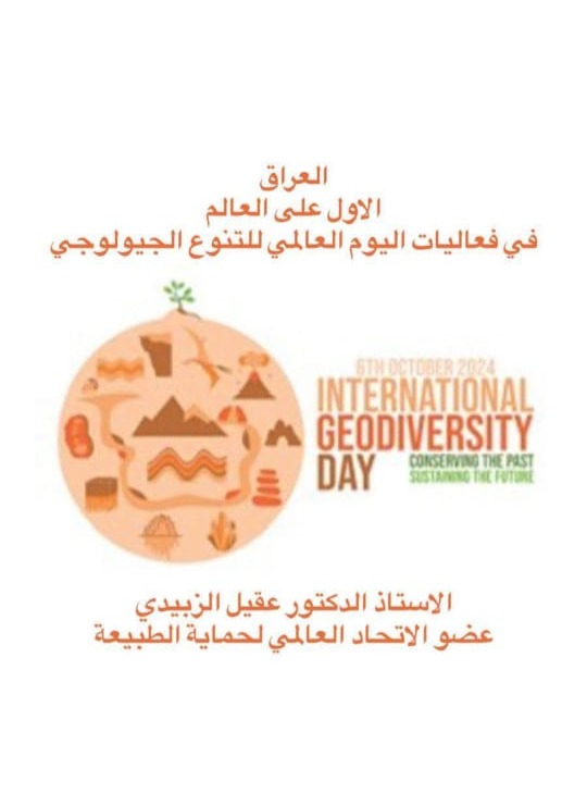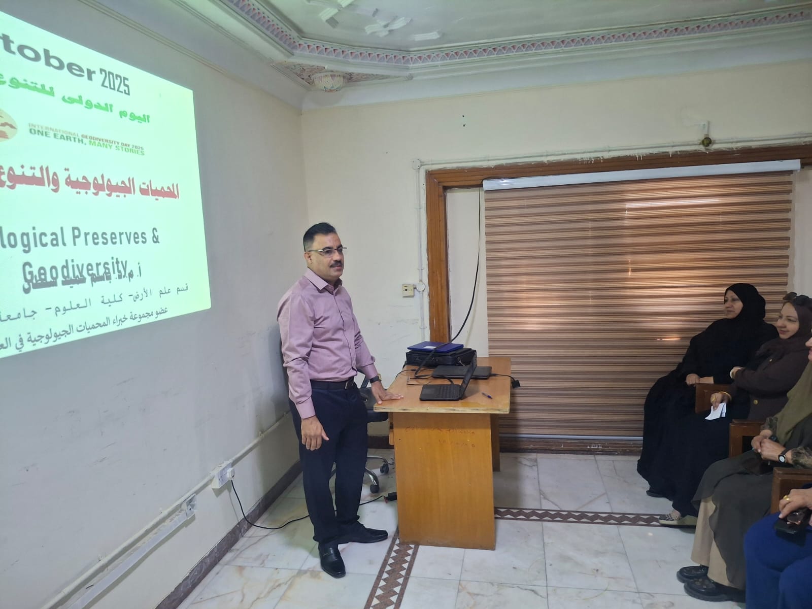 تدريسي من قسم علم الارض بكلية العلوم في جامعة البصرة الدكتور باسم حميد سلطان يلقي ندوة علمية في متحف التاريخ الطبيعي في جامعة البصرة بمشاركة مديرة ومنتسبي المتحف ،وذلك بمناسبة اليوم العالمي للتنوع الجيولوجي. وتناولت المحاضرة مفهوم التنوع الجيولوجي الأمريكية وأهميته بالنسبة للإنسان و التعريف بمصطلحات المحميات الجيولوجية والتراث الجيولوجي وضرورة الاهتمام بالمناطق ذات الخصائص الجيولوجية المميزة وضرورة المحافظة عليها.من العبث والتدمير.