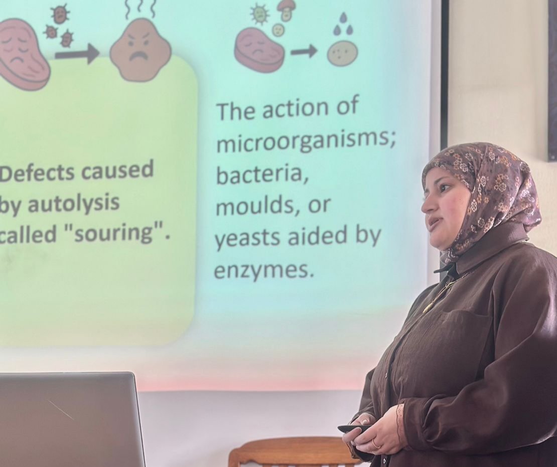 وتضمنت المحاضرة التي حاضرت فيها الندرس المساعد نور سعيد عبدالله العوامل التي تجعل اللحوم بيئة مناسبة لنمو البكتيريا و الفطريات مثل الرطوبة العالية و درجة الحموضة المناسبة مع شرح مظاهر فساد اللحم كالرائحة الكريهة و تغير اللون و ظهور اللزوجة او العفن.