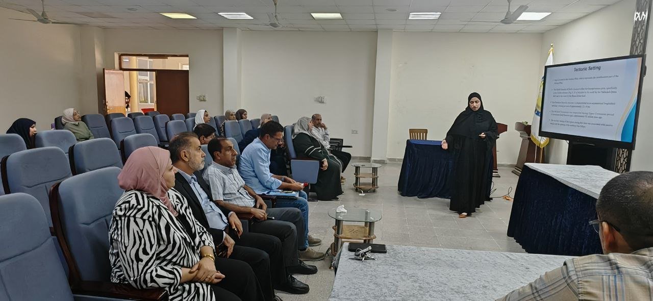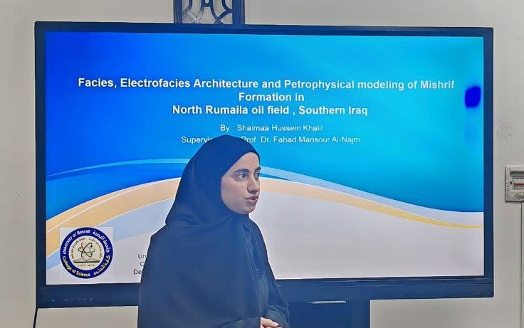 نظمت كلية العلوم في جامعة البصرة حلقة نقاشية عن دراسة المعمارية الكهروسحنية وبناء موديل بتروفيزيائي لخصائص تكوين مشرف في حقل الرميلة الشمالي جنوب العراق . وهدفت الحلقة التي القتها الباحثة شيماء حسين خليل الى معرفة انواع المعمارية الكهروسحنية واجراء تحليل بتروفيزيائي نوعي وكمي لتكوين مشرف . تضمنت الدراسة معرفة طرائق العمل المكتبي باعتماد بيانات الابار واستخدام برامج ,Excel,strater, Ip , Petrel, surfer و طرائق العمل الحقلي التي شملت وصف اللباب الصخري لمكمن الدراسة من بئرين وعمل شرائح رقيقة لوصف : microfacies , Diagensis Proceses , Porosity type.
