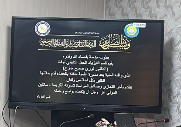 أقام قسم الفيزياء في كلية العلوم – جامعة البصرة حفلاً تأبينيًا للمرحوم الدكتور نوري صبيح جارح، التدريسي في القسم، تقديرًا لمسيرته العلمية وجهوده المخلصة في خدمة التعليم العالي والبحث العلمي.
