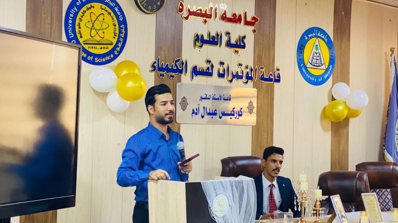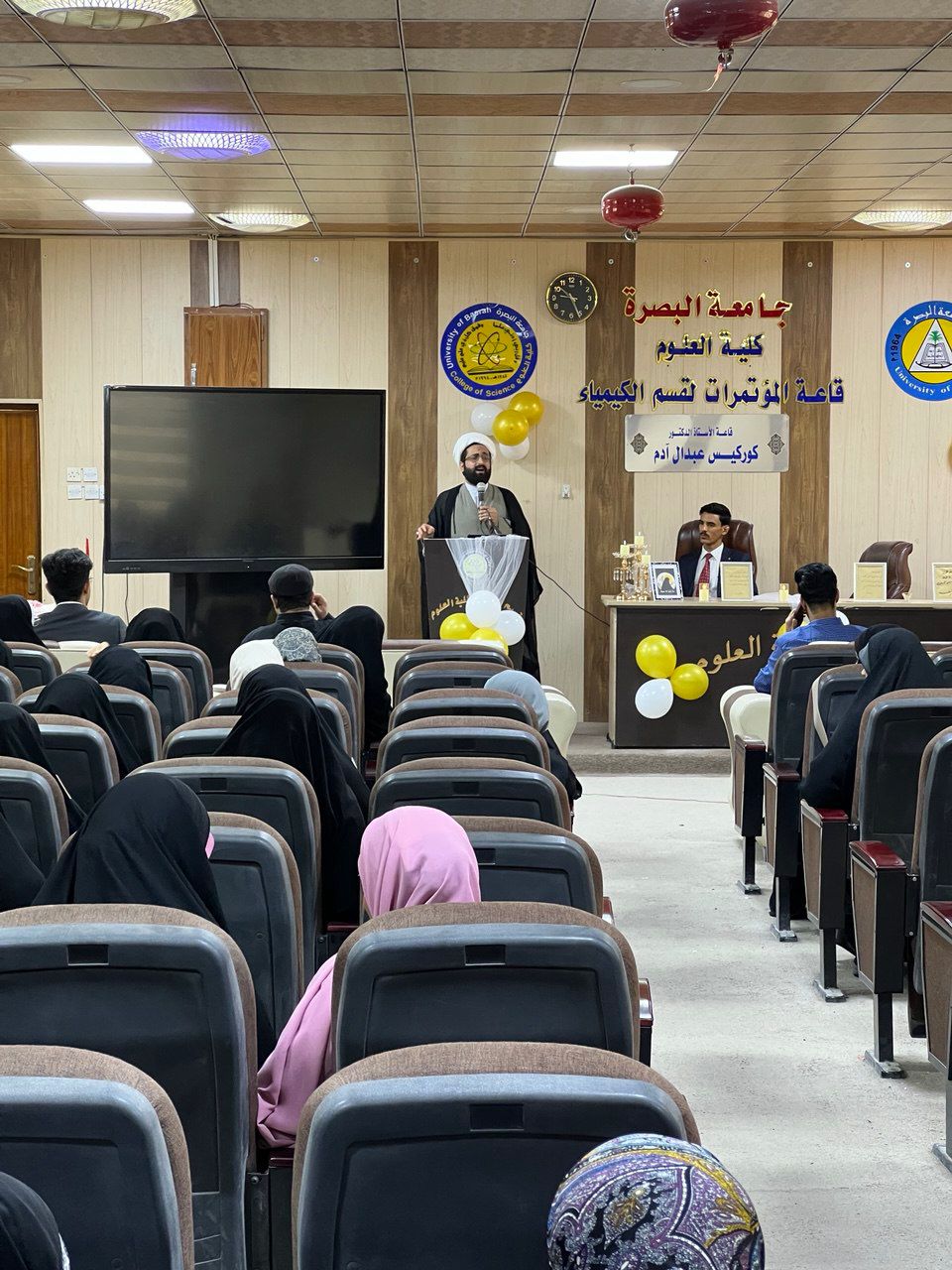 برعاية عميد كلية العلوم الأستاذ الدكتور علي عبد الإمام الرياحي، وبإشراف رئيس قسم الكيمياء الأستاذ الدكتور عباس فاضل عباس، أقام قسم الكيمياء بالتعاون مع شعبة النشاطات الطلابية محفلاً بهيجاً بمناسبة ولادة السيدة زينب (عليها السلام)، وذلك صباح يوم الأربعاء الموافق 10/29 في قسم الكيمياء. شهد المحفل حضور الشيخ محمد الركابي والشاعر هادي محمد والرادود سجاد الحلفي، الذين أضفوا أجواءً روحانية مميزة على الفعالية. واختتم الحفل بتأكيد الحاضرين على استلهام القيم السامية من سيرة السيدة زينب (ع) في الصبر والثبات والعلم.