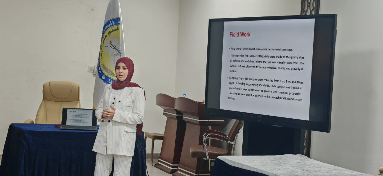 نظّم قسم علم الأرض في كلية العلوم / جامعة البصرة حلقة نقاشية علمية تناولت الدراسة الجيولوجية والجيوتقنية لتحسين الترب الرملية الضعيفة في منطقتي الزبير وسفوان جنوب العراق. وتهدف الدراسة التي القتها الباحثة أزهار عبد الحميد عباس إلى تحديد الخصائص الجيوتقنية والكيميائية للترب الرملية في منطقتي الدراسة وتحسينها باستخدام نسب مختلفة من الأسمنت ومخلفات الإطارات المطاطية، بغية زيادة استقرارها وقابليتها للتحمل وجعلها أكثر ملاءمة للأعمال الهندسية. تضمّنت الحلقة عرض مراحل العمل البحثي المتمثلة في الدراسة المكتبية، والعمل الحقلي الذي شمل جمع العينات من مقالع منطقتي الزبير وسفوان ووصفها موقعيًا، والعمل المختبري الذي تضمن إجراء الفحوصات الجيوتقنية وفق المواصفات القياسية الأمريكية ((ASTM وكذلك الفحوصات الكيميائية.