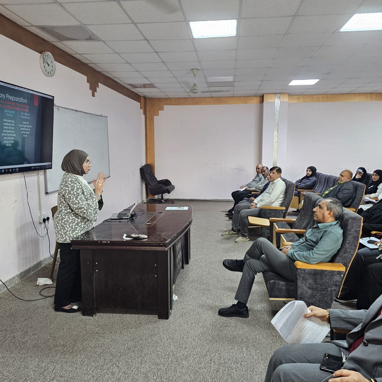 نظمت كلية العلوم في جامعة البصرة ندوة عن طريقة استخلاص وتحضير المتحجرات من الترسبات . وهدفت الندوة الى تعريف الباحثين وطلبة الدراسات العليا بالطرق المتبعة مختبريا لتحضير المتحجرات الدقيقة بأنواعها. وتضمنت الندوة التي حاضرت فيها التدريسي م.د.رشا عبد الستار كشيش - م.د.صبا قاسم كلخان مقدمة عن المتحجرات الدقيقة واضحت ان المتحجرات هي بقايا أو آثار كائنات حية دقيقة حفظت في الصخور الرسوبية، مثل الدياتومات، وحبوب اللقاح، والفرومينيفيرا والاوستراكودا وغيرها .وهي تُعد من أهم الأدلة في دراسة تاريخ الأرض والبيئات القديمة لأنها تساعد على تحديد عمر الطبقات الجيولوجية وتفسير الظروف المناخية القديمة. كما تم عرض طرق استخلاصها وفصلها من الرواسب بطرق فيزيائية وكيميائي، مثل الغسل بالماء، واستخدام الأحماض لإزالة المواد غير المرغوبة، ثم الغربلة أو الطرد المركزي للحصول على العينات النقية. ومن ثم اجراء الفحص تحت المجهر لتحديد الأنواع ودراسة شكلها وبنيتها الدقيقة.