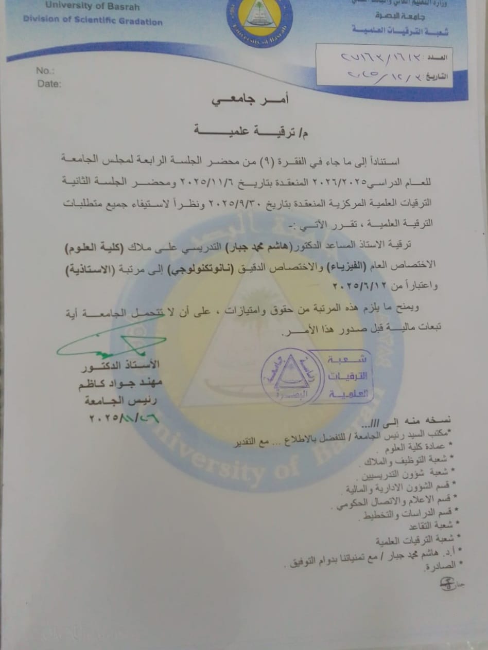 تم ترقية التدريسي الدكتور هاشم محمد جبار في قسم الفيزياء بكلية العلوم في جامعة البصرة إلى مرتبة أستاذ حسب توصيات اللجنة المركزية للترقيات في جامعة البصرة. سائلين المولى عز وجل له دوام التوفيق والسداد.