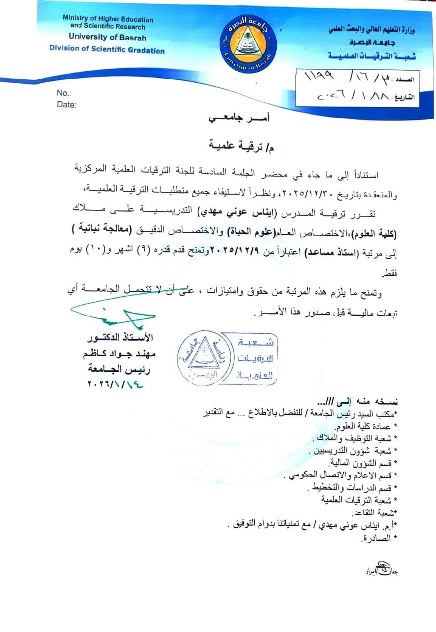تم ترقية التدريسية ايناس عوني مهدي في قسم علم البيئة بكلية العلوم- جامعة البصرة إلى مرتبة استاذ مساعد حسب تعليمات لجنة الترقيات المركزية في جامعة البصرة.