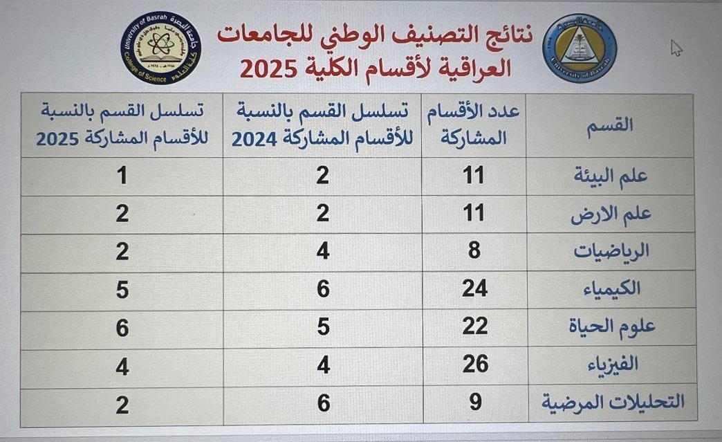حققت كلية العلوم إنجازًا أكاديميًا متميزًا بحصولها على مراكز متقدمة في تصنيف الأقسام العلمية على مستوى الجامعات والكليات الحكومية والأهلية لعام 2025، حيث احرزت كلية العلوم على المرتبة الأولى لقسم علم البيئة من أصل 11 قسم مشارك والمرتبة الثانية لقسم علم الأرض من أصل 11 قسم مشارك..والمرتبة الثانية لقسم الرياضيات من أصل 8 أقسام مشاركة والمرتبة الثانية لقسم التحليلات المرضية من أصل 9 أقسام مشاركة. في مؤشر واضح على المكانة العلمية الرصينة التي تتمتع بها الكلية.