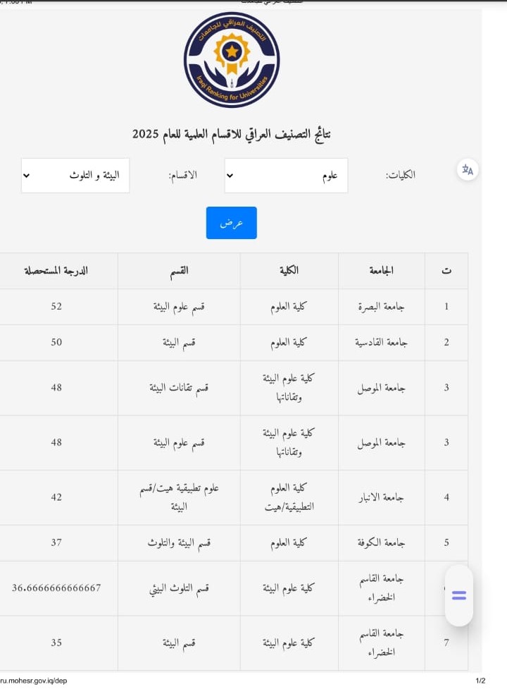 حقق قسم علم البيئة في كلية العلوم إنجازاً اكاديمياً متميزاً بحصوله على المركز الأول في تصنيف الاقسام العلمية على مستوى الجامعات والكليات الحكومية والأهلية لعام 2025 من اصل 11 قسم مشارك.