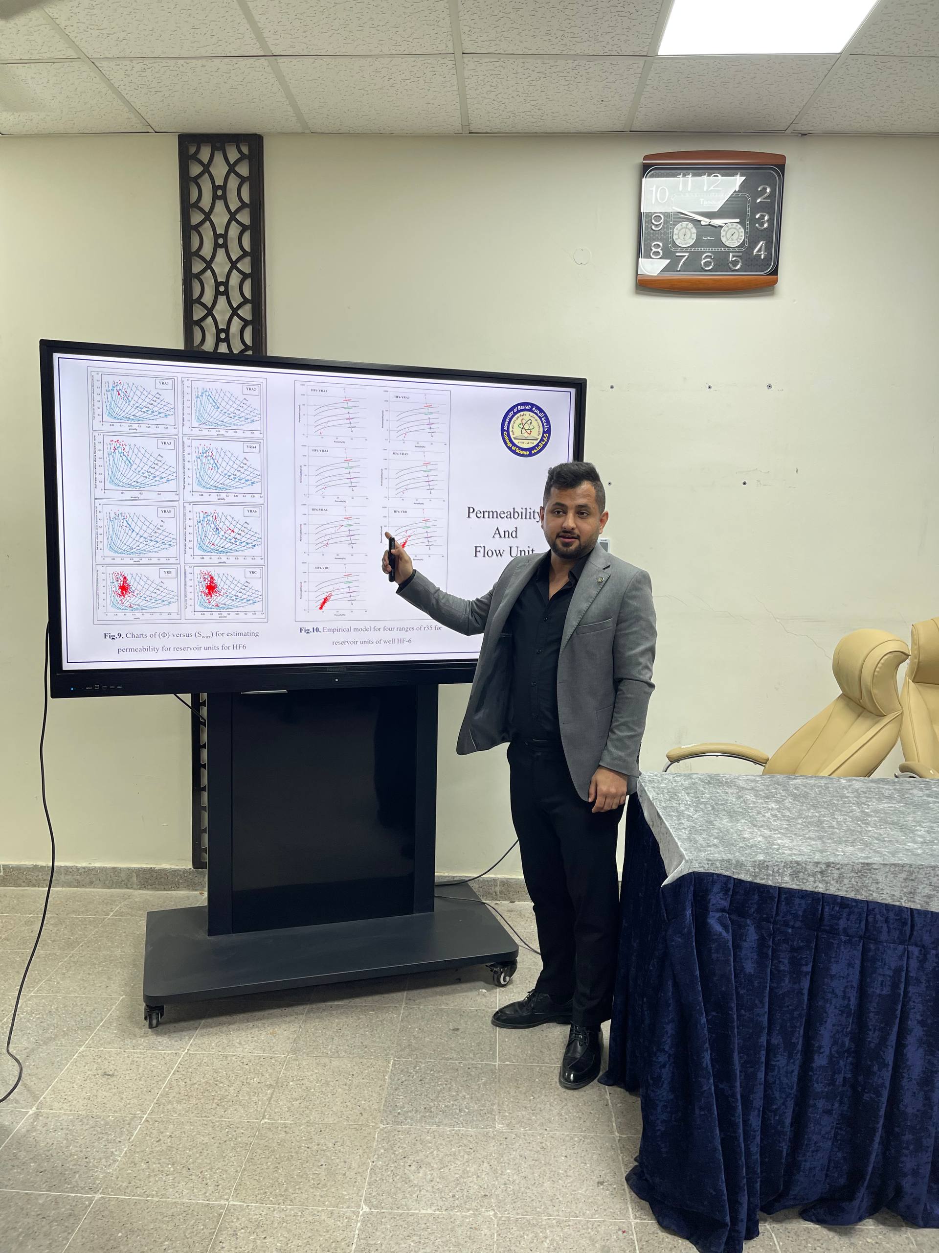 وتضمنت الندوة التي حاضر فيها الباحث حسين عبدالامير عبدالواحد عرض نتائج تحليل بيانات عدد من الآبار في الحقل باستخدام برنامجي Techlog وPetrel، حيث تم تفسير السجلات البئرية مثل أشعة غاما والمقاومية والنيوترون والكثافة لتحديد نوع الصخور وتقدير المسامية والتشبع الهيدروكربوني وحجم الطين. وأظهرت النتائج أن التكوين يتكون أساسًا من الحجر الجيري مع تداخلات من الحجر الجيري الطيني والطفل، كما تم تقسيمه إلى الوحدات الطباقية YRA وYRB وYRC. وأوضحت الدراسة أن وحدة YRA تمتاز بقيم مقاومية أعلى وتشبع هيدروكربوني أكبر كما بينت النتائج وجود تغيرات في نسبة الطين والمعادن وتأثيرها في المسامية والنفاذية داخل المكمن. وأوصت الحلقة بأهمية التكامل بين الدراسات الجيولوجية والبتروفيزيائية باستخدام تحاليل اللباب الصخري، كما توصي باستخدام المجسات المتقدمة للحصول على نتائج أدق مثل مجسNMR, FMI .