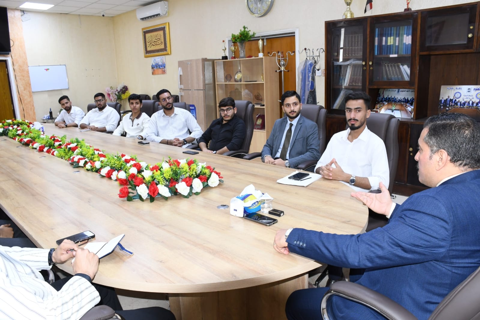 التقى السيد عميد كلية العلوم الدكتور علي عبدتلامام الرياحي بممثلي طلبة الاقسام وممثلي المراحل الدراسية في كلية العلوم لمناقشة أبرز القضايا التي تهم الطلبة والوقوف على احتياجاتهم الأكاديمية والخدمية. شهد الاجتماع أجواءً إيجابية سادها التفاعل البنّاء، حيث أتيحت الفرصة لممثلي الطلبة لطرح مختلف التحديات التي تواجه زملاءهم، بدءًا من الجوانب العلمية وصولًا إلى الجوانب الخدمية المتعلقة بالبنية التحتية والبيئة الجامعية.