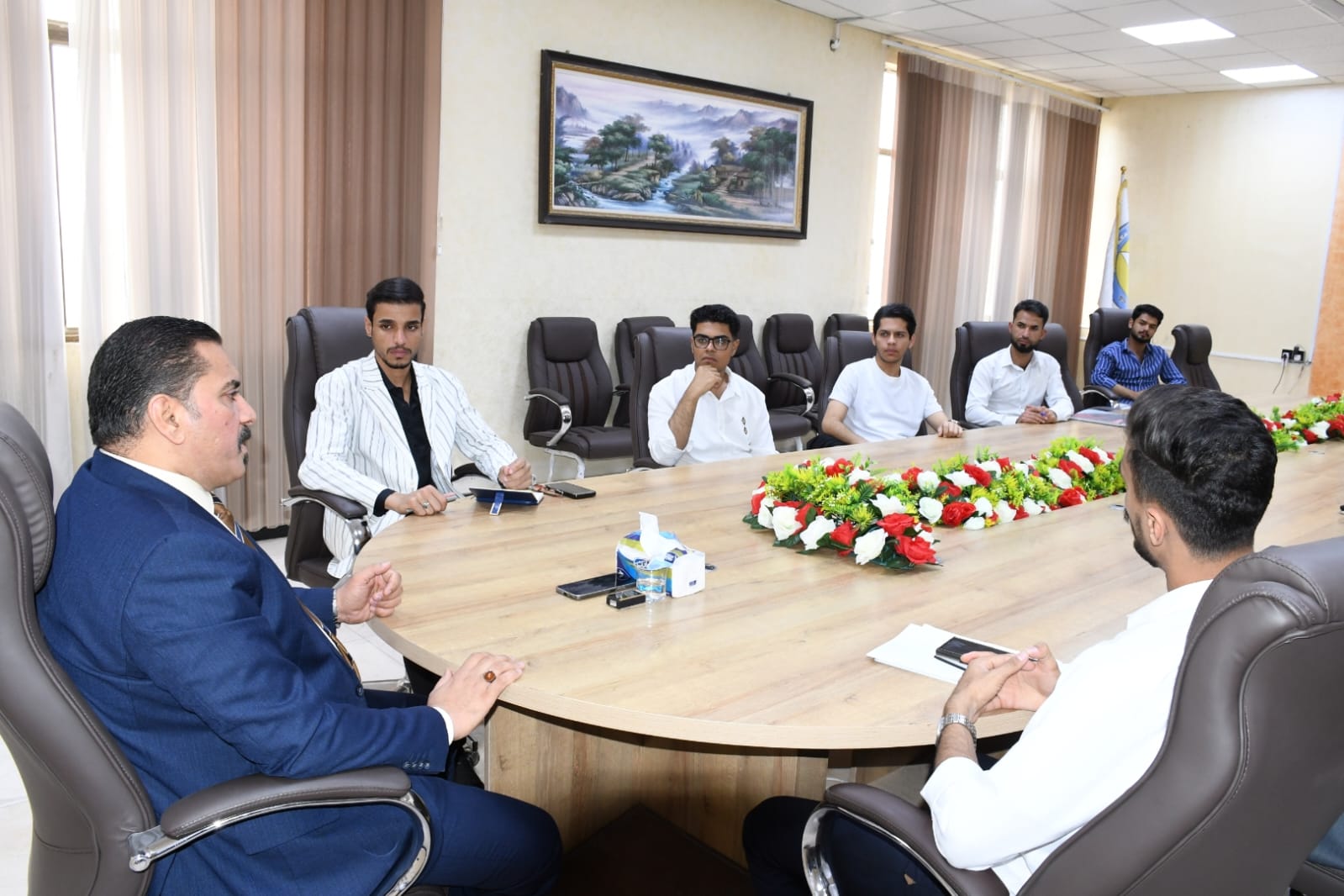 من جانبه، أبدى السيد العميد اهتمامًا كبيرًا بمداخلات الطلبة، مؤكدًا أن آراءهم ومقترحاتهم تمثل حجر الأساس في عملية التطوير المستمر. كما أشار إلى أن عمادة الكلية تسعى دائمًا إلى تذليل العقبات وتوفير كل ما من شأنه دعم المسيرة العلمية، ضمن الإمكانيات المتاحة.كما تم خلال الاجتماع التطرق إلى عدد من المقترحات التطويرية، التي من شأنها تحسين جودة التعليم وتعزيز الأنشطة الطلابية، إضافة إلى بحث آليات متابعة تنفيذ الحلول المقترحة، بما يضمن تحقيق نتائج ملموسة على أرض الواقع.ويأتي هذا اللقاء تأكيدًا على نهج إدارة الكلية في اعتماد مبدأ الشفافية والانفتاح، وترسيخ ثقافة الحوار الهادف، بما يسهم في بناء جيل واعٍ قادر على المشاركة الفاعلة في تطوير مؤسسته التعليمية.وفي الختام، أعرب ممثلو الطلبة عن شكرهم وتقديرهم للسيد العميد على سعة صدره وحرصه على الاستماع إلى جميع الآراء، مؤكدين استمرارهم في نقل صوت الطلبة بكل أمانة، والعمل بروح الفريق الواحد لما فيه مصلحة الكلية وطلبتها