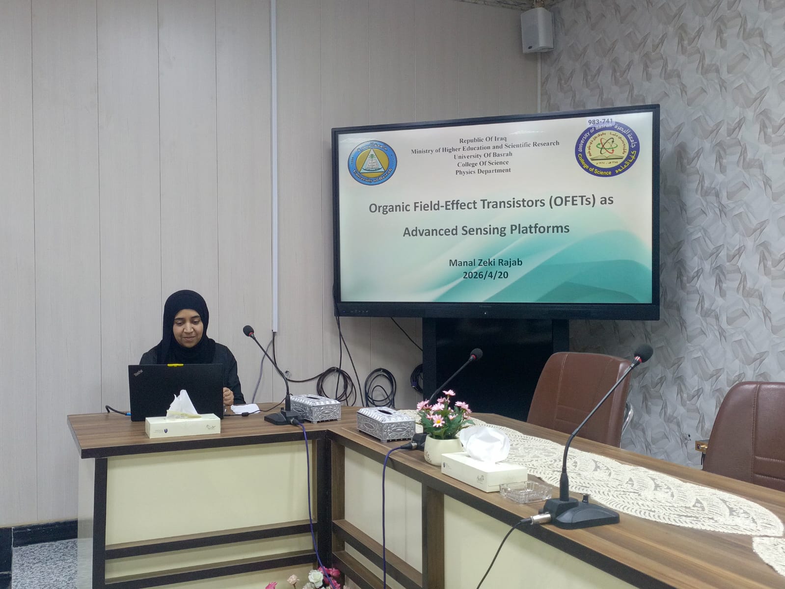 نظّم قسم الفيزياء بكلية العلوم في جامعة البصرة حلقة نقاشية عمل بعنوان (ترانزستورات تأثير المجال العضوي كمنصات استشعار متطورة)، حاضر فيها التدريسية الدكتورة منال زكي رجب، وبمشاركة عدد من التدريسيين والطلبة. وهدفت الورشة إلى توضيح مبدأ عمل ترانزستورات تأثير المجال العضوي (OFETs) وبيان خصائصها الفيزيائية والإلكترونية، فضلاً عن استعراض دورها كمنصات استشعار ذات حساسية عالية في التطبيقات البيئية والطبية.