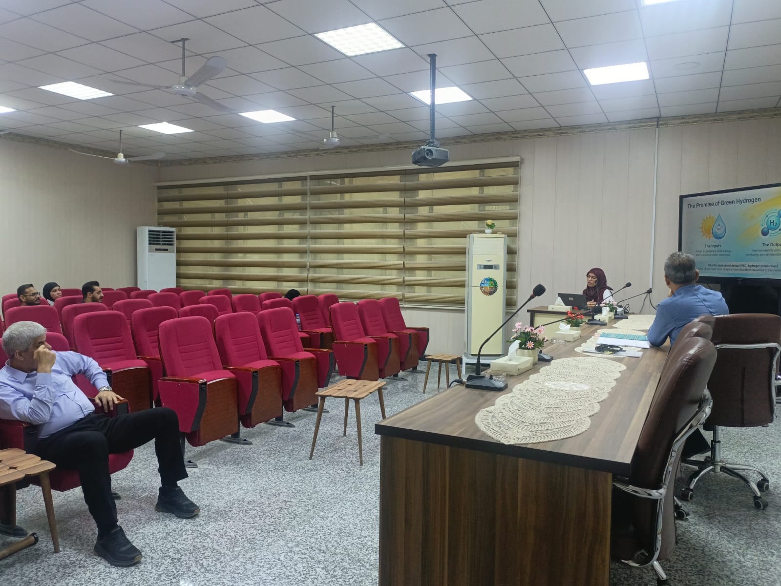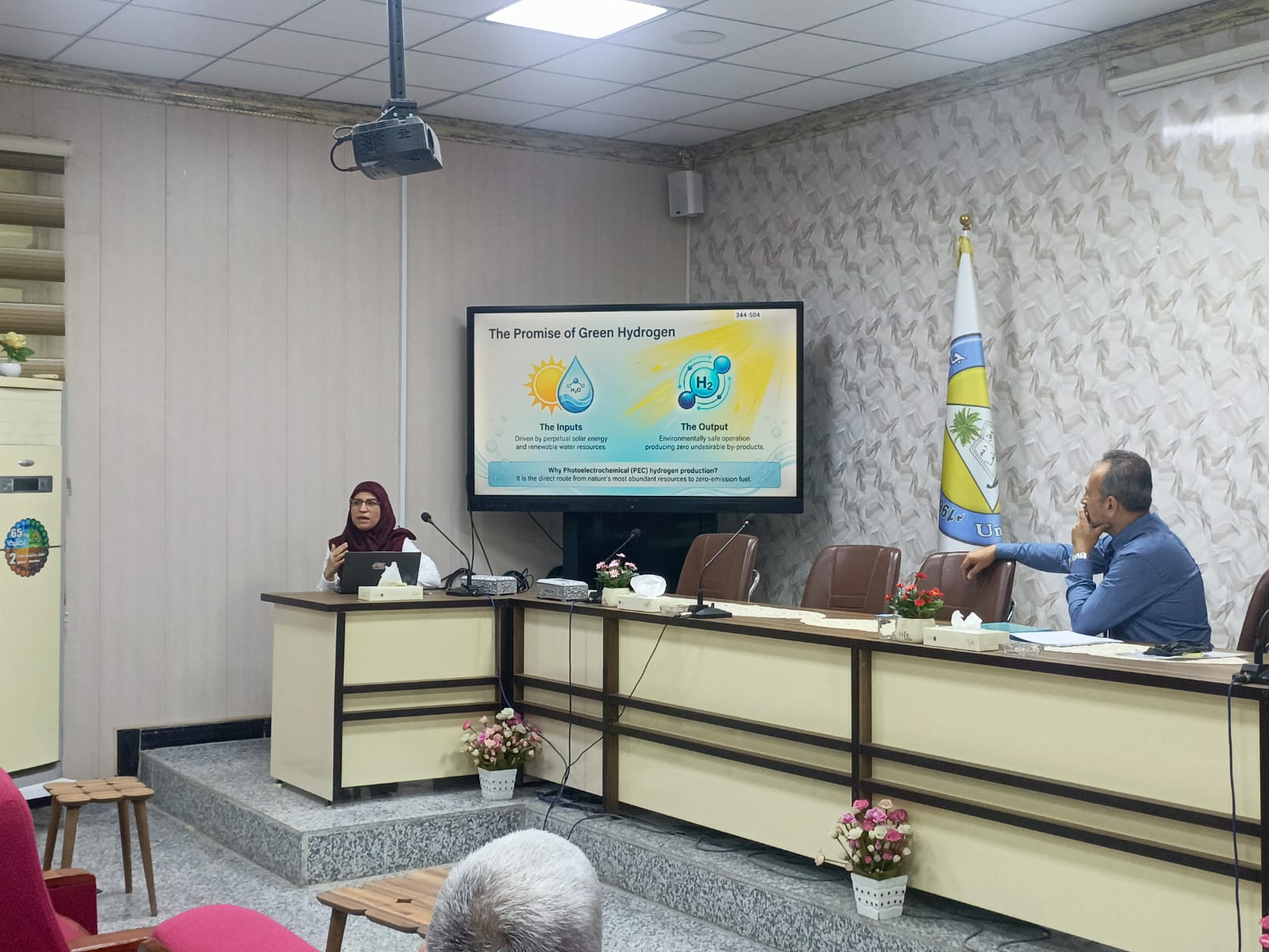 وهدفت الحلقة نقاشية إلى التعريف بتقنية التحلل الكهروضوئي للماء بوصفها من الحلول المستدامة لإنتاج الهيدروجين الأخضر عبر استثمار الطاقة الشمسية. كما تضمنت شرح آلية عمل الخلايا الكهروضوئية المعتمدة على أشباه الموصلات، وأبرز التحديات المتعلقة بالكفاءة والاستقرار.